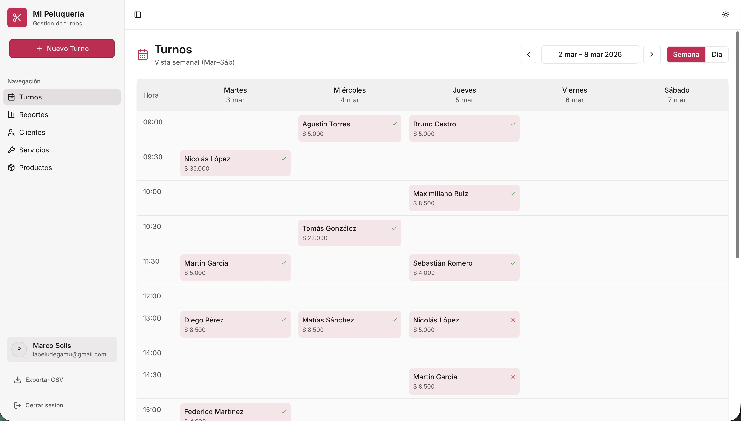 Mirá todos los turnos de la semana de un vistazo. Hacé click en cualquier horario libre para agendar uno nuevo. Cambiá entre vista semanal y diaria con un toque.